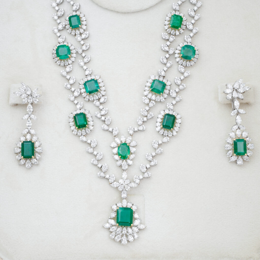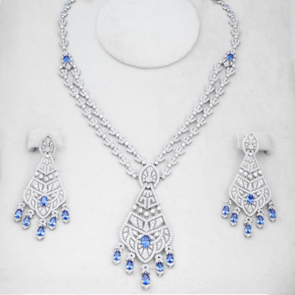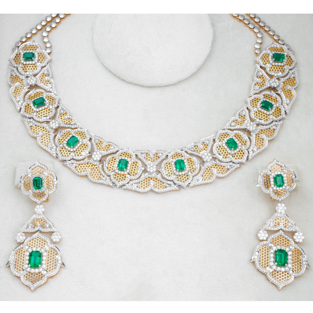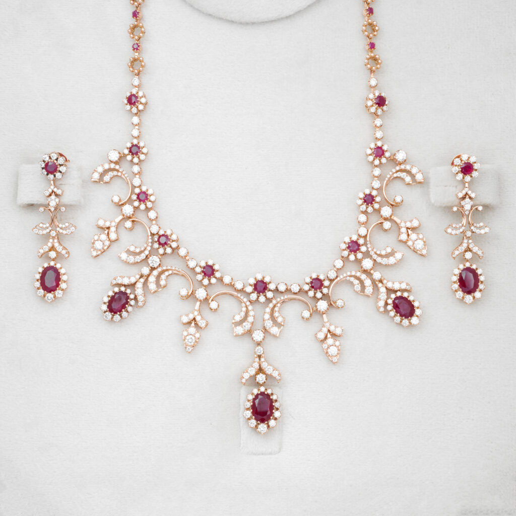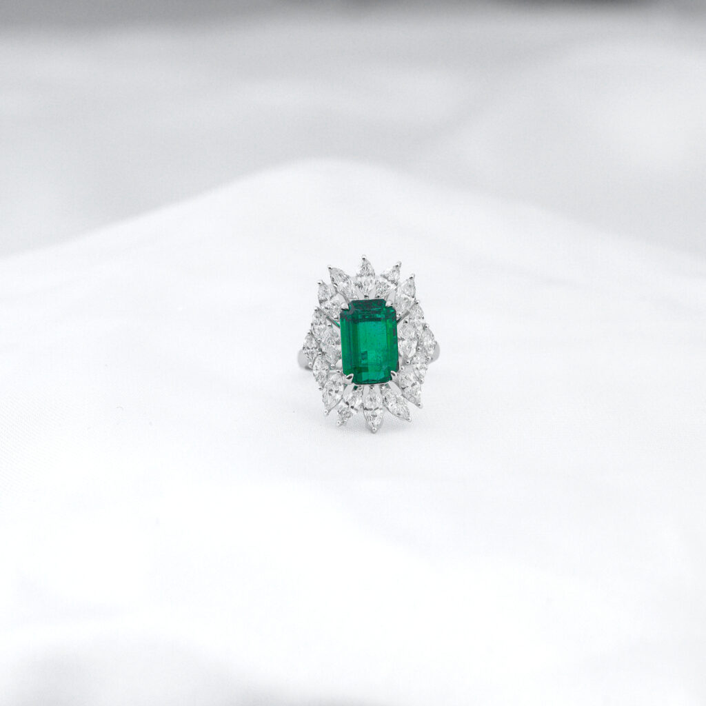 The ring is intricately designed with a central cluster of brilliant-cut diamonds surrounded by a halo of smaller, sparkling diamonds. The band is also adorned... Continue reading