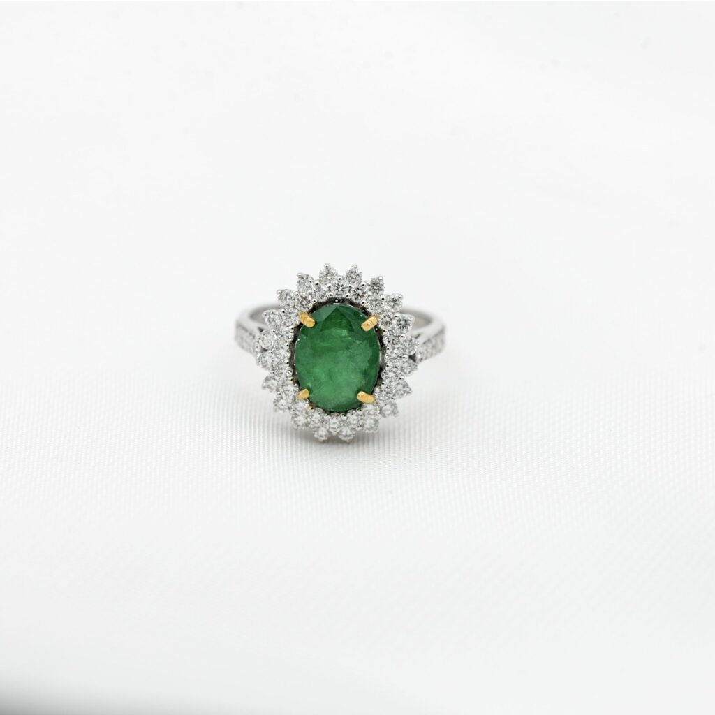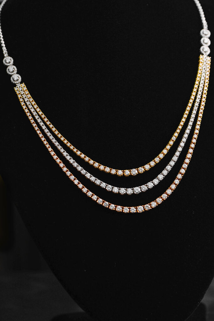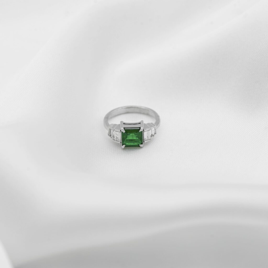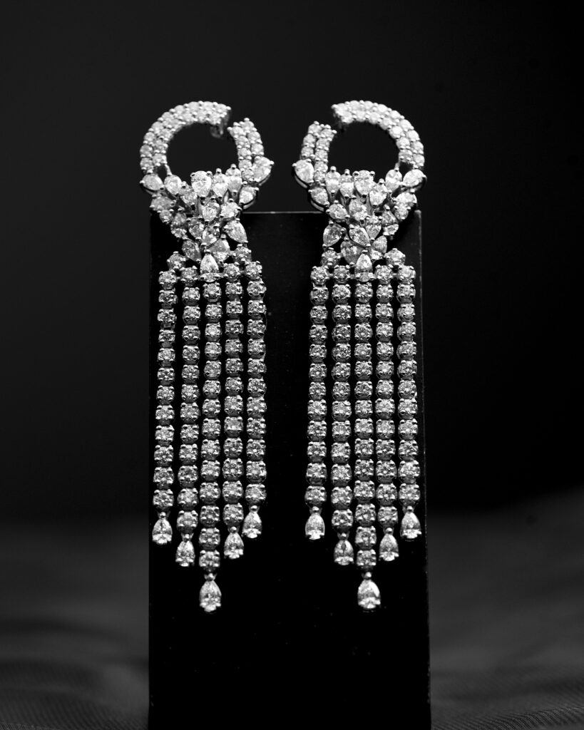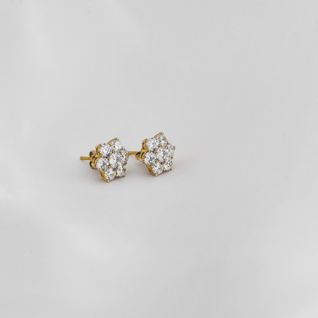 A pair of exquisite gold and diamond stud earrings, presented against a sleek black background that accentuates their sparkle. Each earring features a square design,... Continue reading