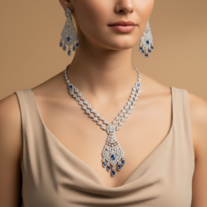 A breathtaking blue sapphire and diamond necklace set, featuring an elaborate statement necklace and matching chandelier earrings. The necklace presents a dual-strand design composed of intricate, diamond-studded leaf or feather-like motifs. These strands converge into a magnificent, multi-tiered pendant that boasts intricate diamond scrollwork, centered by a round blue sapphire, and adorned with dangling pear-shaped blue sapphires.