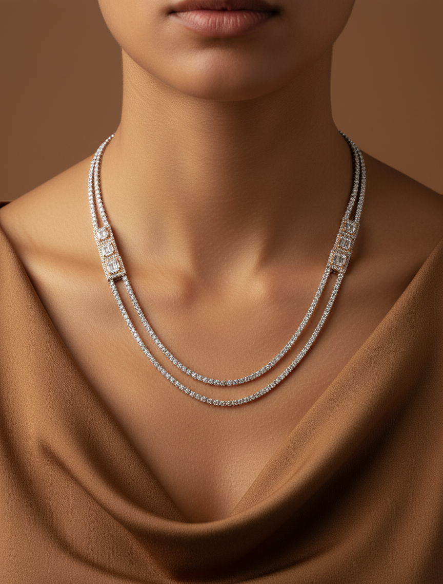 A sophisticated diamond necklace featuring layered strands accented with geometric diamond stations.