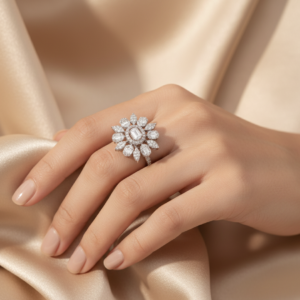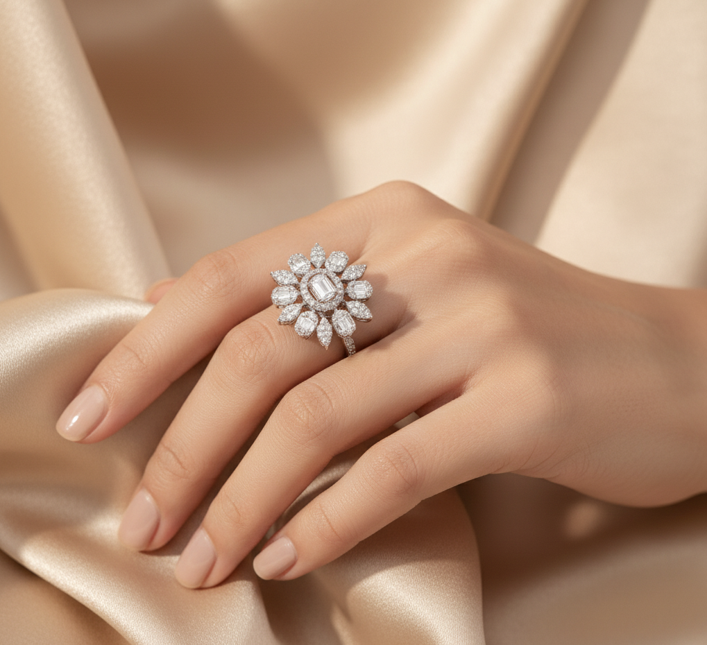 The ring is intricately designed with a central cluster of brilliant-cut diamonds surrounded by a halo of smaller, sparkling diamonds. The band is also adorned with diamonds, adding to its luxurious appeal.