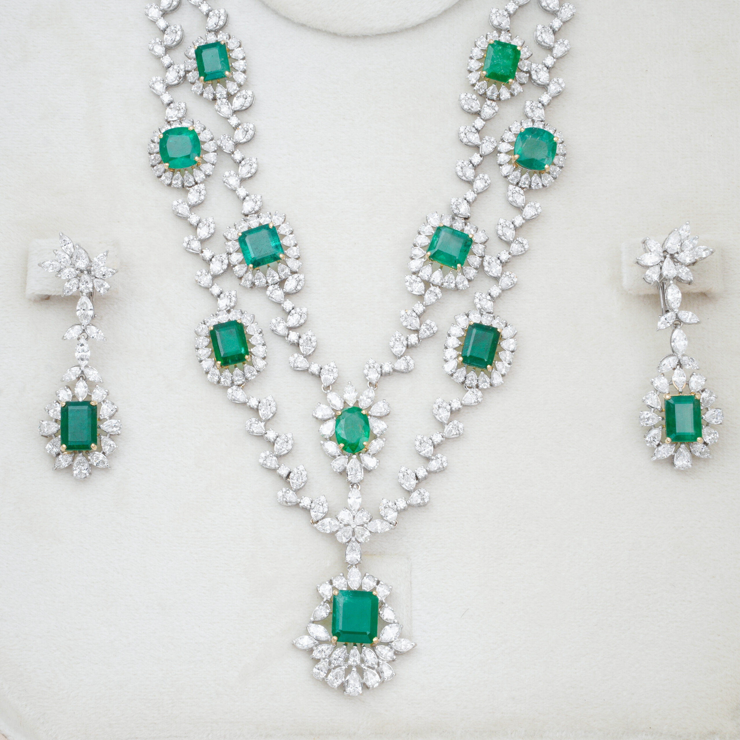 An absolutely magnificent green emerald and diamond necklace set, comprising a stunning statement necklace and matching drop earrings. The necklace features a series of vibrant, rectangular emeralds, each surrounded by a dazzling halo of brilliant diamonds, interconnected by intricate diamond-encrusted floral or leaf-like motifs.