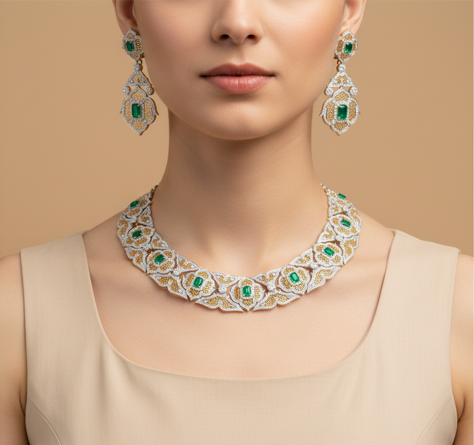 An extraordinarily opulent and intricate green emerald, gold, and diamond necklace set, complete with matching chandelier-style earrings. The necklace is a bold, wide collar design, featuring a repeating pattern of white gold or platinum lattice-work encrusted with brilliant diamonds, alongside sections of fine yellow gold filigree.