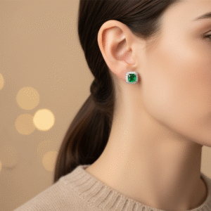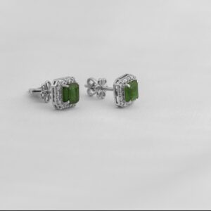 The green stones are either faceted or cabochon-cut, set in clean bezel or prong mounts that enhance their glow. Suspended from simple hooks, they are ideal for both daytime grace and evening elegance.