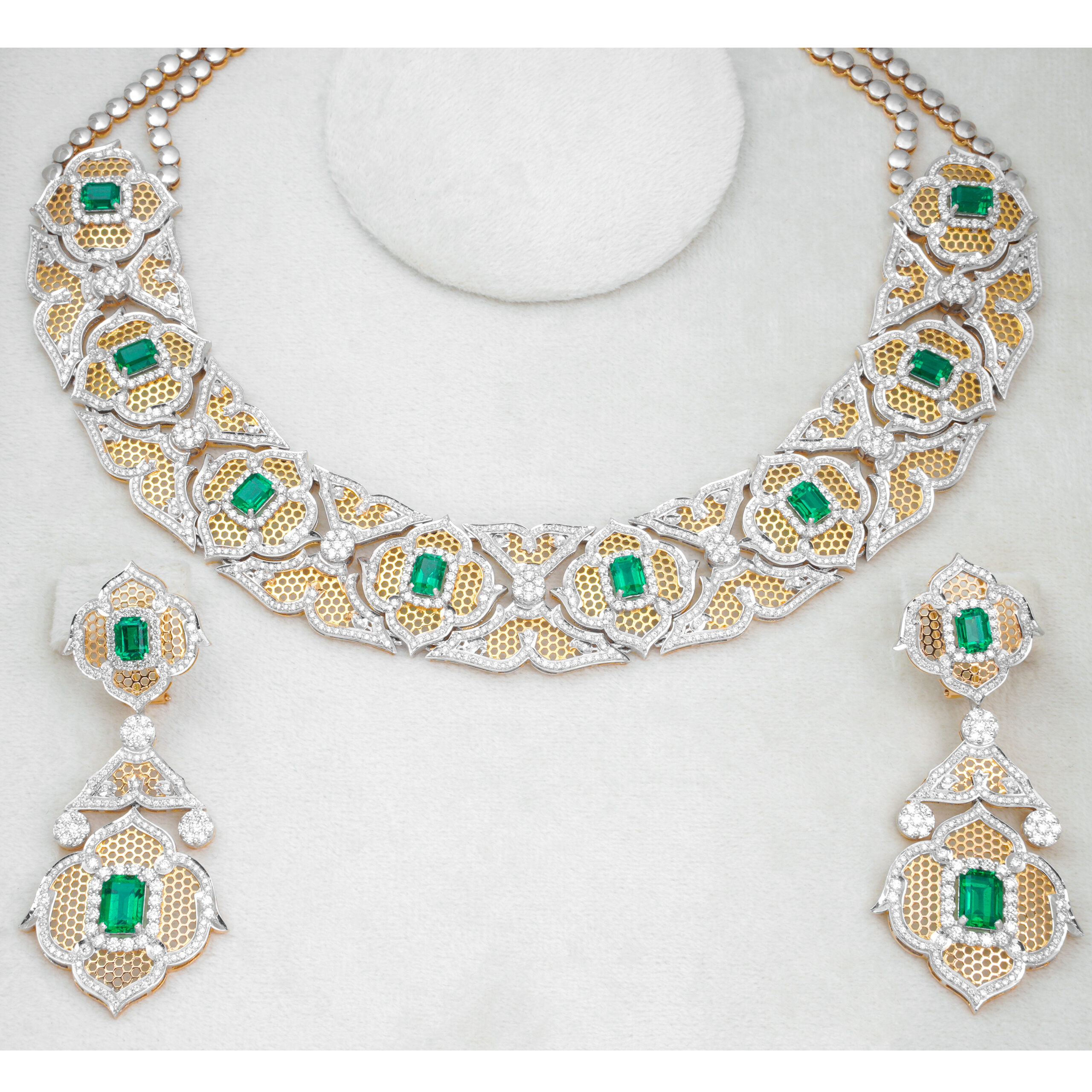 An extraordinarily opulent and intricate green emerald, gold, and diamond necklace set, complete with matching chandelier-style earrings. The necklace is a bold, wide collar design, featuring a repeating pattern of white gold or platinum lattice-work encrusted with brilliant diamonds, alongside sections of fine yellow gold filigree.