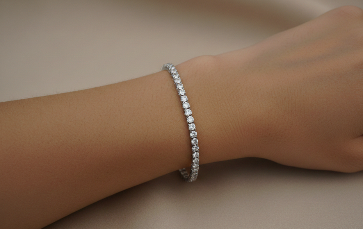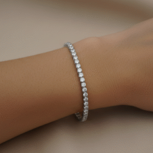An elegant silver tennis bracelet featuring a continuous line of sparkling round-cut diamonds, delicately set to create a timeless and refined look. Perfect for adding subtle luxury to both everyday wear and special occasions.